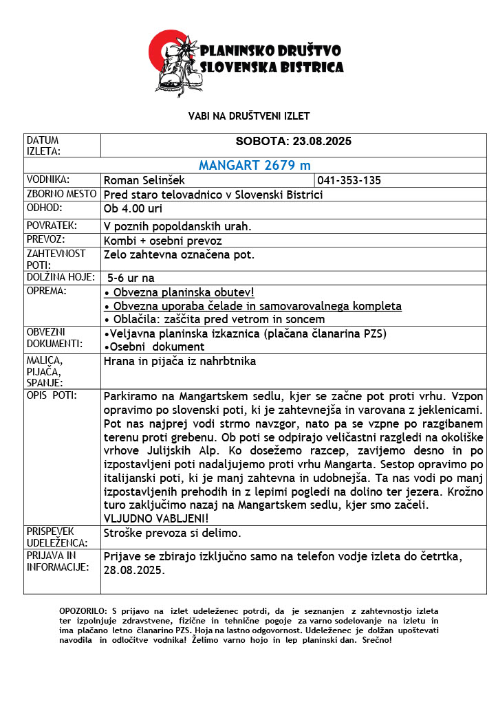 VABILO – 23.08.2025 MANGART(2679m) pdsb18 avgusta, 2025 Vabljeni na planinski izlet. Vabljeni na mangart