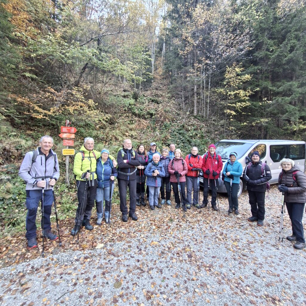 Zbrala se naj je kar lepa skupina (okoli 15). Iz Gornjega grada smo krenili proti Lenartu. Asfaltna cesta se je kmalu spremenila v ozek vijugast makadam, kjer smo našli prostor za parkiranje. Jaz tu ne bi vozila, zato: »Hvala, fantje!«