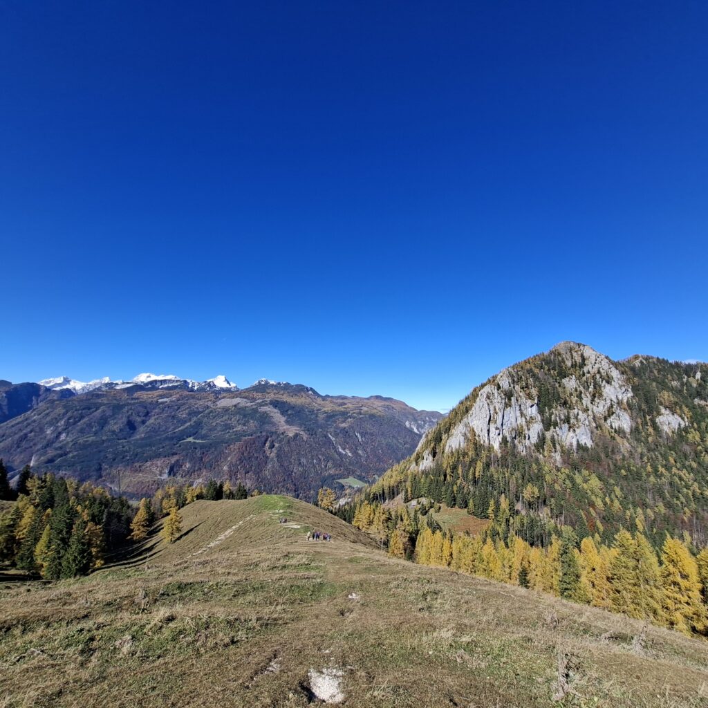 Tukaj smo se spustili na Kal (1285 m). Kratek počitek z malico na soncu. Škoda, da je pihal močan veter.