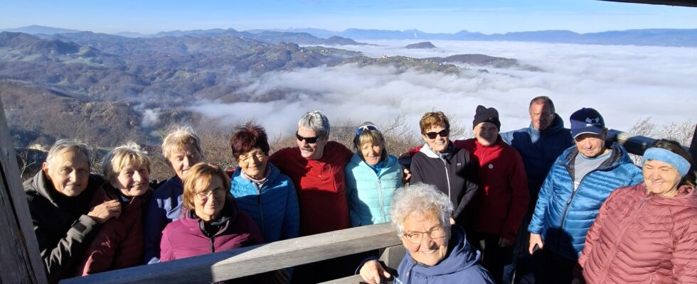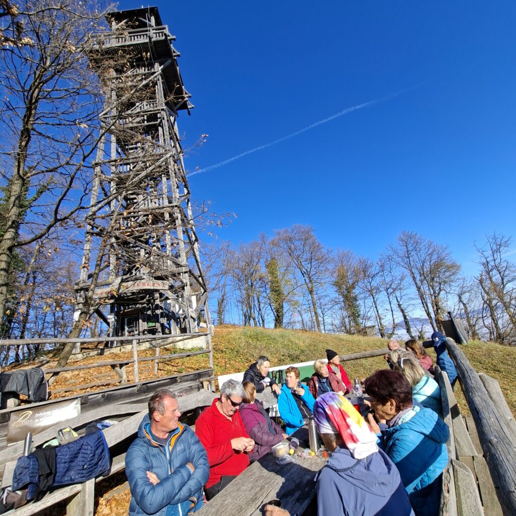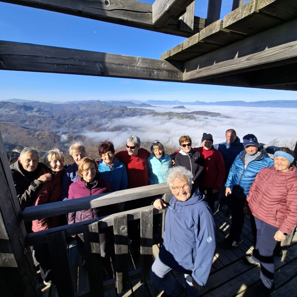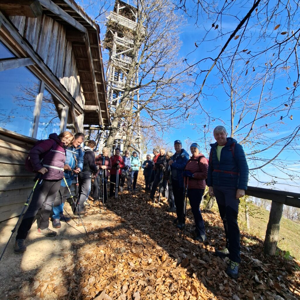 Na vrh smo se povzpeli po strmi poti, večji del po gozdu obdanem v čudovitih barvah jeseni. Ko smo se dvignili malo višje, se je pokazalo sonce in naredil se je prijeten sončen dan, v dolini pa je bilo še megleno. Že med potjo smo občudovali okoliške vrhove (Boč, Donačko, Pohorje, Kamniške alpe, Peco, Uršljo goro…), ki so štrleli nad meglicami. Po prihodu na rob večjega kamnoloma, pa smo po uri in pol hoje, bili že skoraj na vrhu. Tu stoji nov leseni stolp-stolp ljubezni, ki je visok 25,9 m. Povzpeli so se na vrh in uživali ob pogledih, od koder se vidi doberšen del Slovenije tudi Triglav.