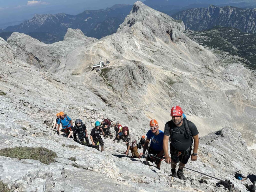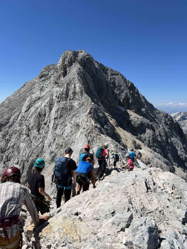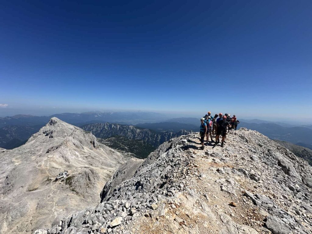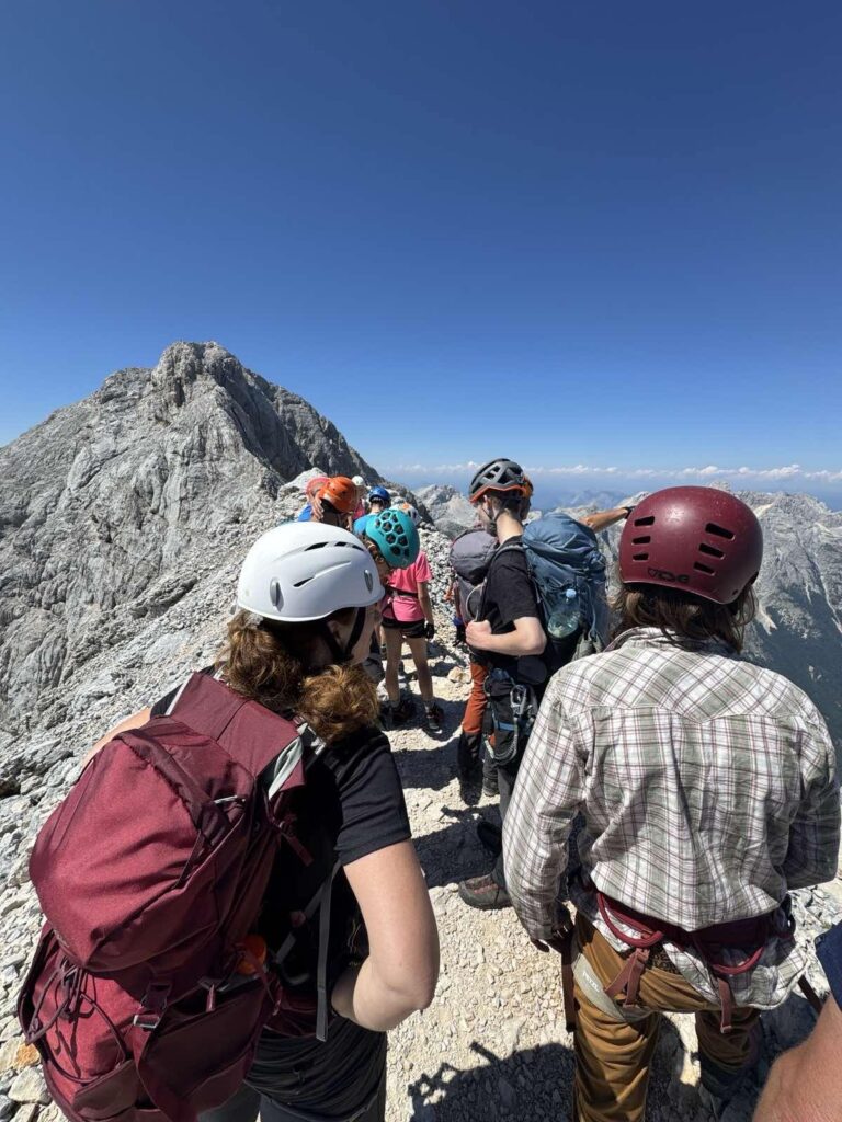 Pot nas je nato vodila čez Konjsko sedlo do koče Planika pod Triglavom, kjer smo se lahko okrepčali pred velikim vzponom. Po ravno prav dolgem počitku in klepetu smo nadeli čelade ter samovarovalne komplete in nadaljevali pot proti vrhu. Vzpon čez Mali Triglav je bil počasen in previden, a je hkrati ponujal čudovite poglede na dolino ter okoliške vrhove – z ene strani pogled na Kredarico in severno Triglavsko steno, z druge pa pogled proti Bohinju in neskončni verigi hribov. Korak za korakom smo napredovali, dokler se ni pred nami pokazal Aljažev stolp – simbol slovenstva in ponos vseh planincev.