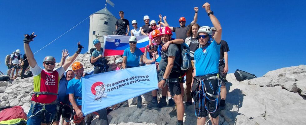 Kot napovedano, je bilo nebo brez oblačka. Na vrhu nas je tako pričakal popoln razgled. Stali smo na strehi Slovenije in svet se je razprostiral na vse strani. Pred skupnim fotografiranjem je sledil še poseben obred: krst kar devetih planincev, ki smo prvič osvojili Triglav.