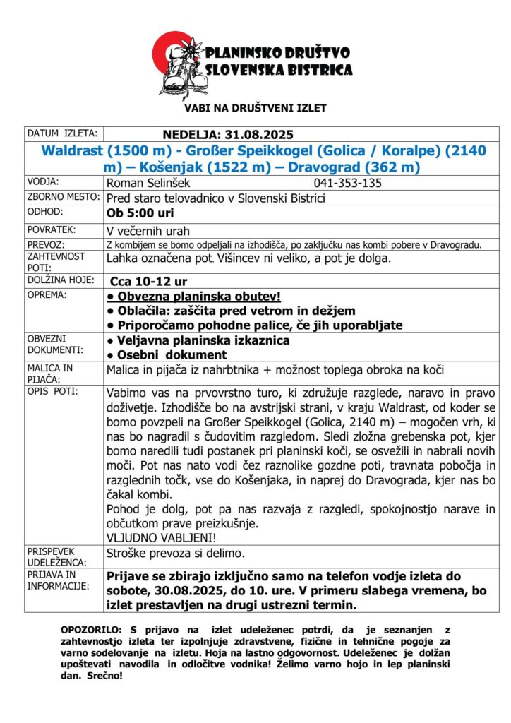 VABILO – KORALPE / GOLICA 31.08.2025