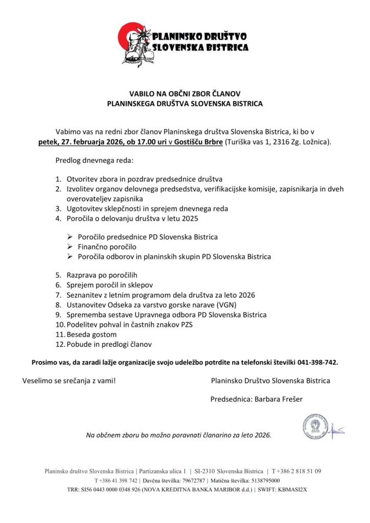 vljudno vas vabimo, da se nam pridružite na rednem zboru članov Planinskega društva Slovenska Bistrica, ki bo v petek, 27. februarja 2026, ob 17.00 v Gostišču Brbre (Turiška vas na Pohorju 1, 2316 Zgornja Ložnica).